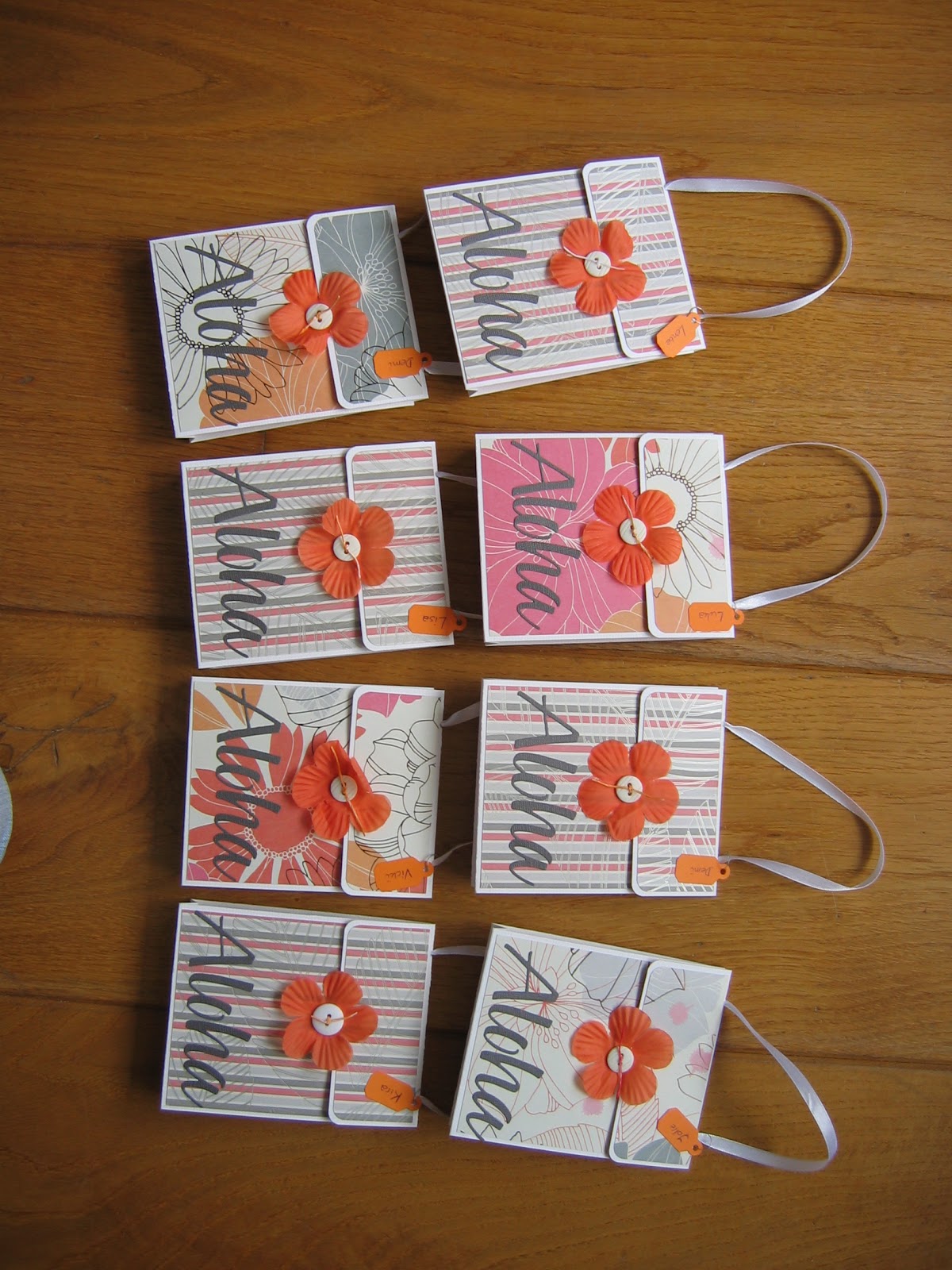 Het zijn uitnodigingen voor het hawai feest van Kira met papier van S.E.I., de stempel hawai tilda is van Magnolia. De letters op de voorkant met de quickutz alfabeth Emily gemaakt en de bloemen zijn van een hawai krans.